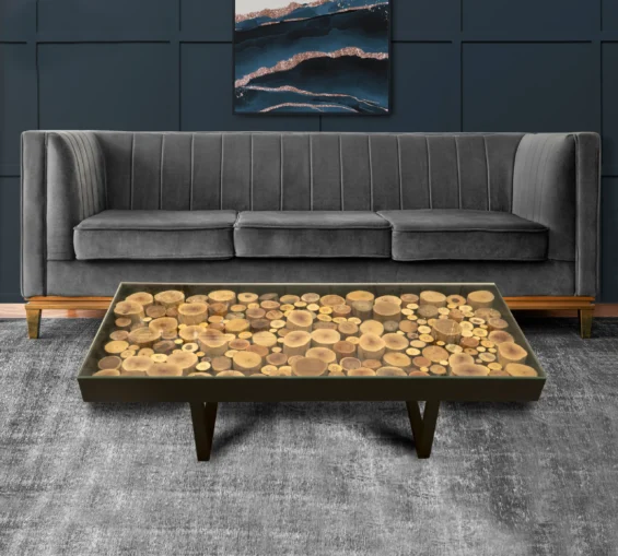 Ashwood Olivewood and various exotic wood slices fashioned into a functional art piece coffee table.