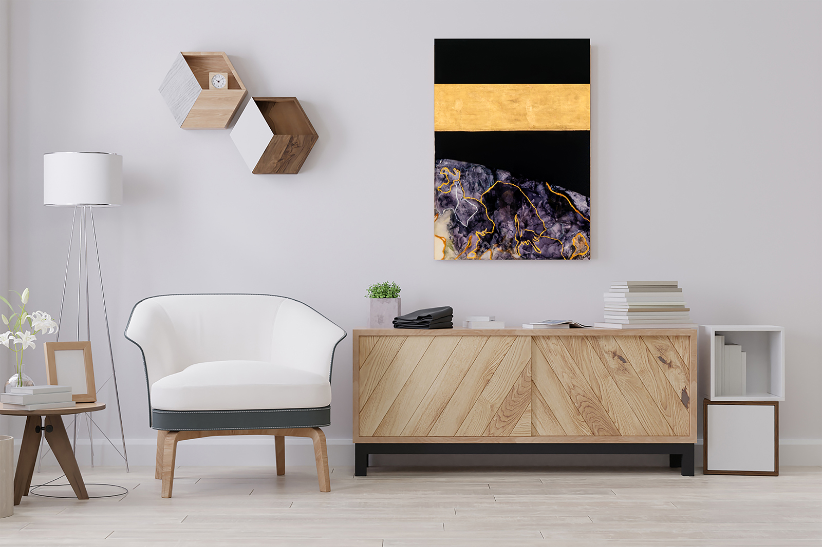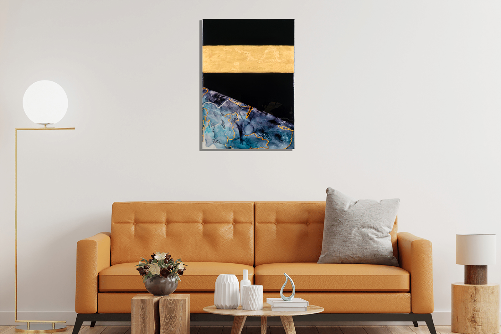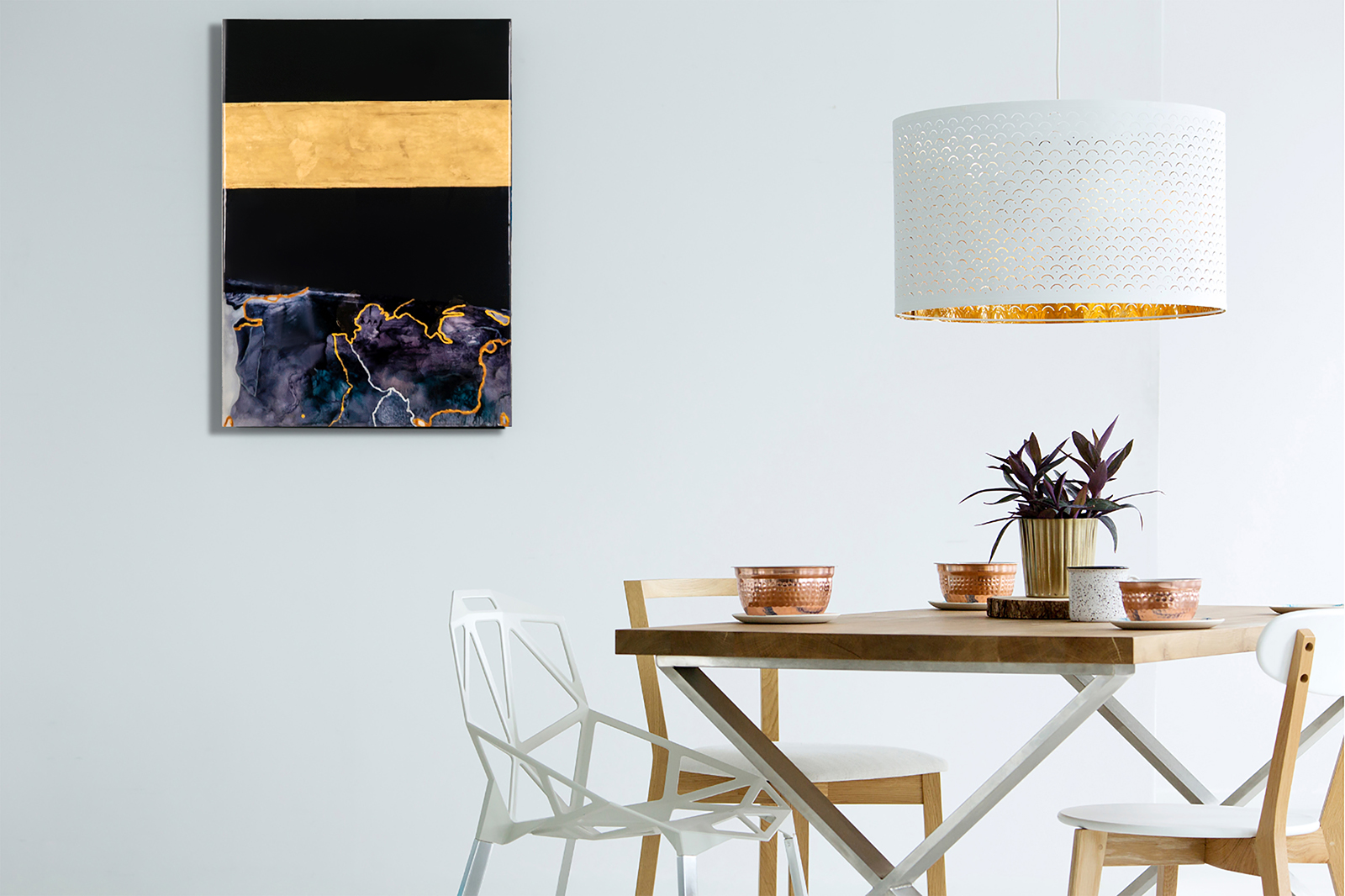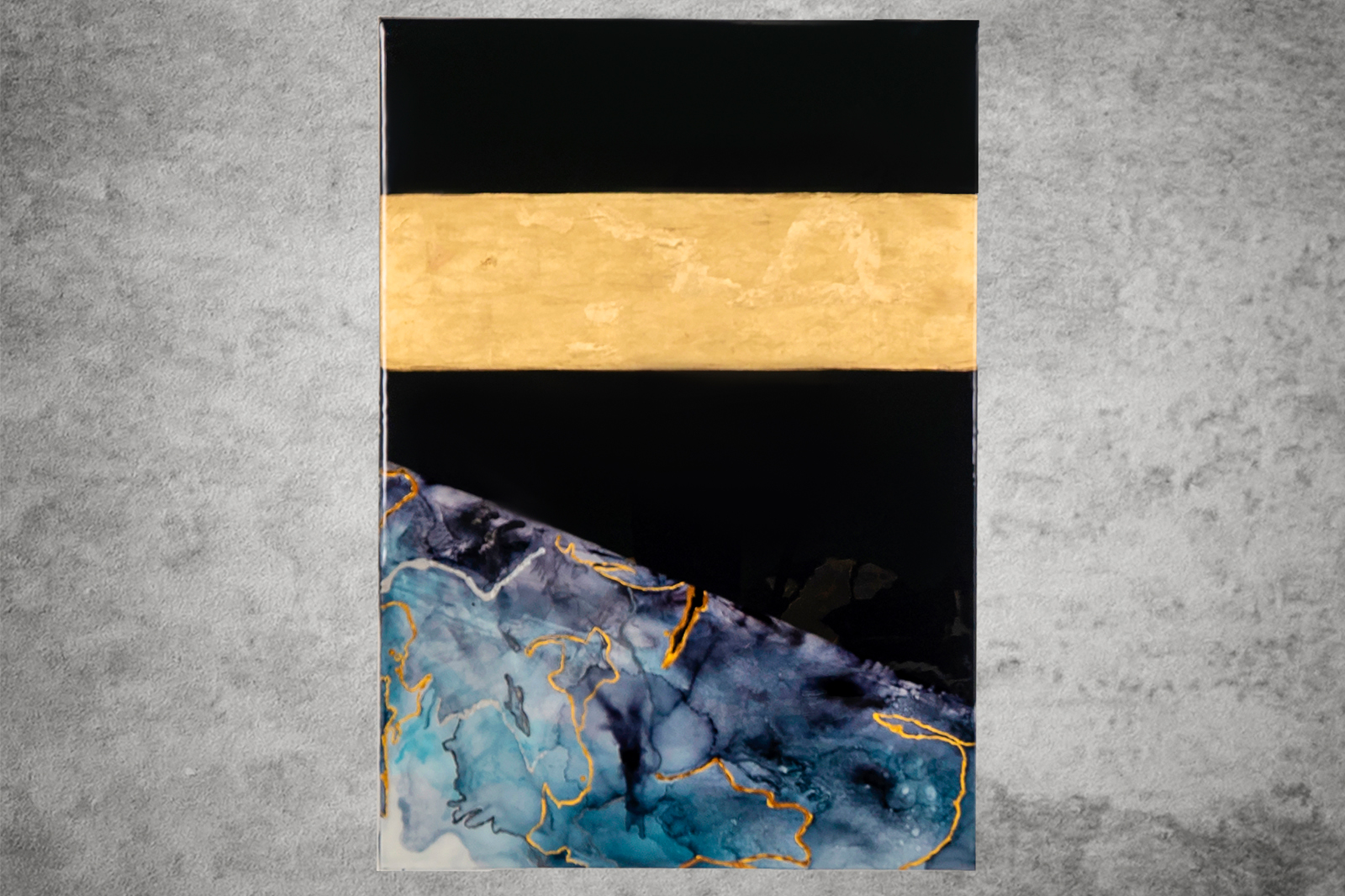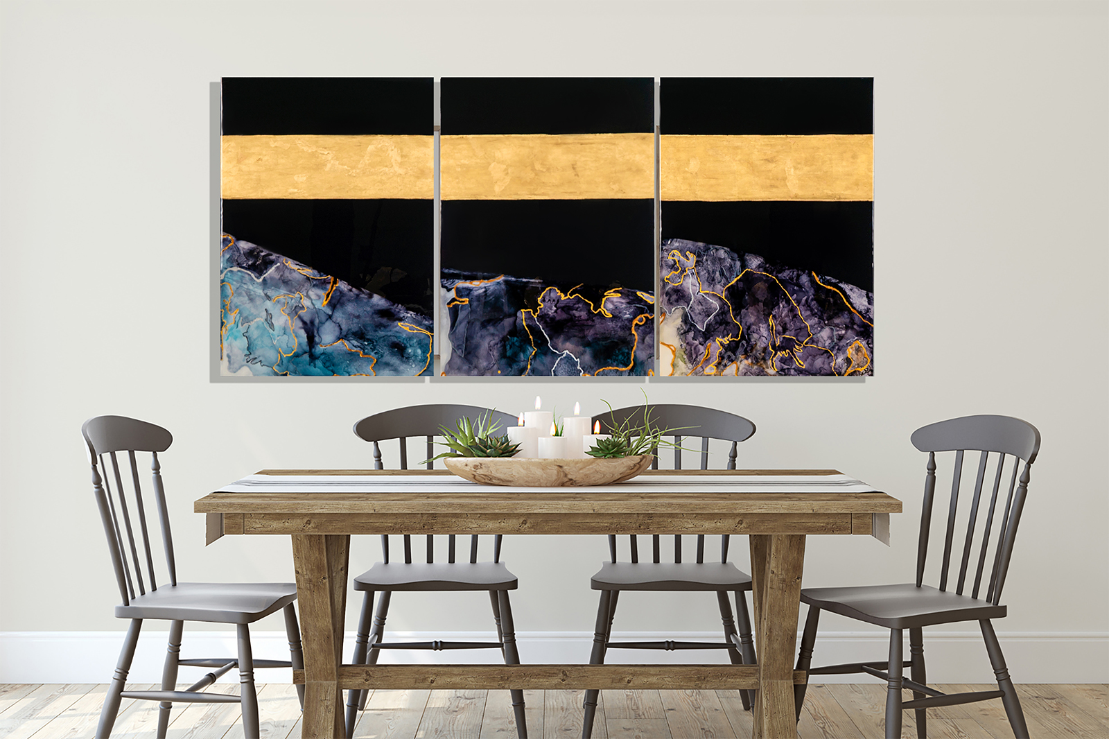 At the heart of “Eternity” lies a unifying element—a wide band of gold foil that gracefully traverses the width of each panel, seamlessly binding them together into a cohesive whole. This golden thread serves as a visual anchor, grounding the disparate elements of the artwork in harmonious unity. It symbolizes the interconnectedness of the cosmos, reminding viewers of the underlying order that permeates even the most seemingly chaotic of phenomena.