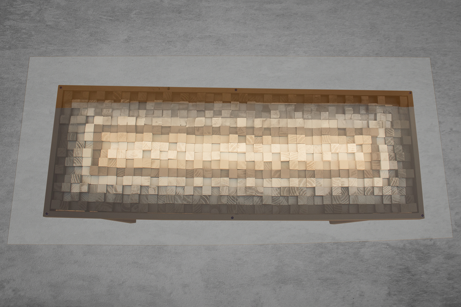 After the full artboard has been assembled and securely adhered, it is framed in a custom-made steel frame. The frame, a mix of industrial strength and refined design, complements the natural beauty of the wood and the subtle colors of the piece. The final touch is a sheet of 10 to 12mm thick glass, straight-cut, bright-polished, and with softly touched corners. The glass cover not only protects the artwork but enhances its presentation, adding a layer of sleek modernity to the earthy composition beneath.