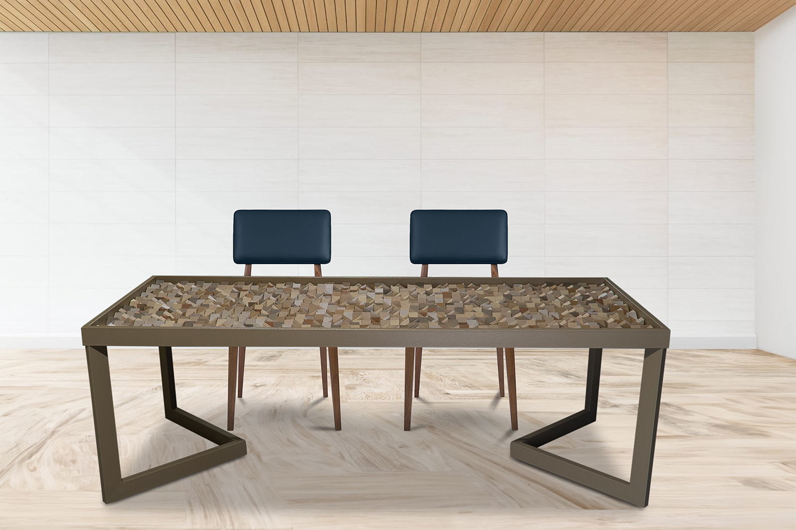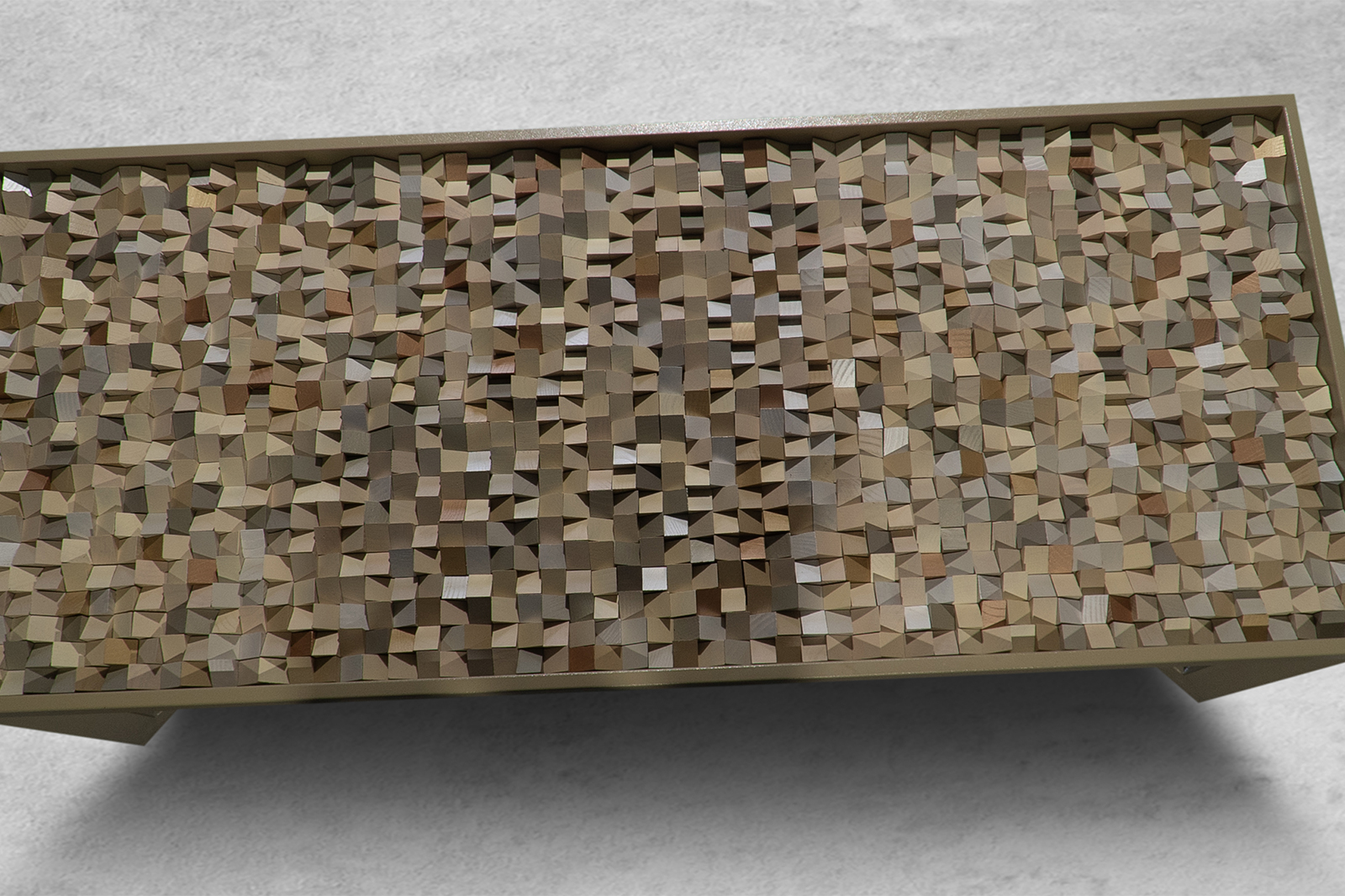 After the full artboard has been assembled and securely adhered, it is framed in a custom-made steel frame. The frame, a mix of industrial strength and refined design, complements the natural beauty of the wood and the subtle colors of the piece. The final touch is a sheet of 10 to 12mm thick glass, straight-cut, bright-polished, and with softly touched corners. The glass cover not only protects the artwork but enhances its presentation, adding a layer of sleek modernity to the earthy composition beneath.