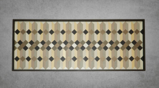 Once the paint has dried, the pieces are sealed again, protecting the vibrant hues and ensuring they endure over time. Now, the process of assembly begins. The individually prepared blocks are carefully pasted onto a base substrate, arranged in a pattern that adheres to the artist’s original vision. The design is both structured and organic, with each block playing a role in the overall composition while maintaining its individuality.