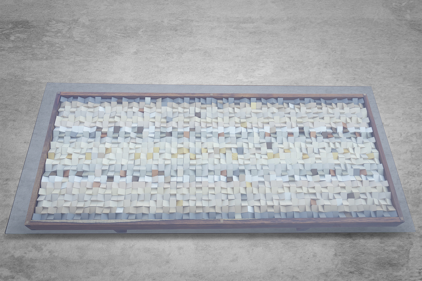 After the full artboard has been assembled and securely adhered, it is framed in a custom-made steel frame. The frame, a mix of industrial strength and refined design, complements the natural beauty of the wood and the subtle colors of the piece. The final touch is a sheet of 10 to 12mm thick glass, straight-cut, bright-polished, and with softly touched corners. The glass cover not only protects the artwork but enhances its presentation, adding a layer of sleek modernity to the earthy composition beneath.